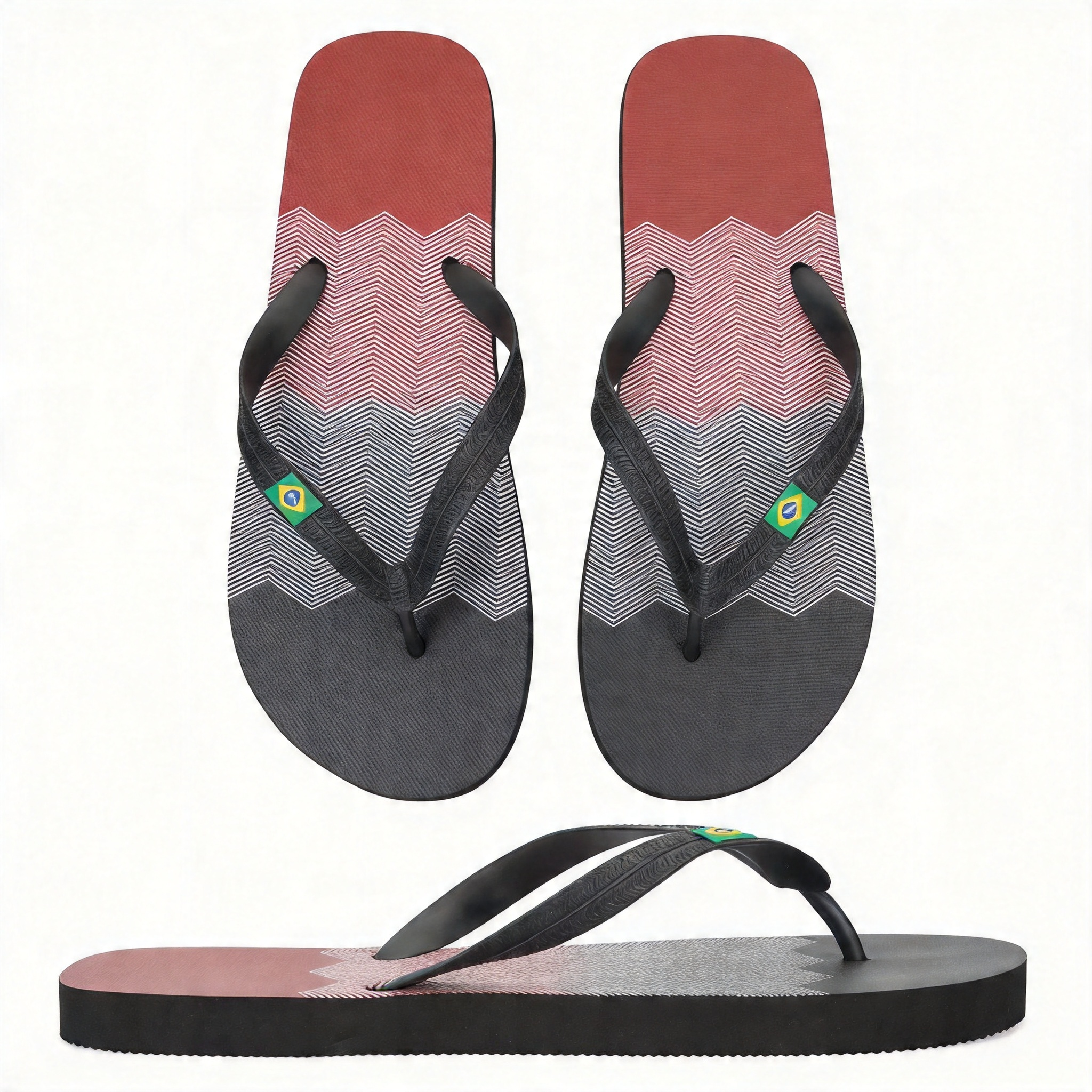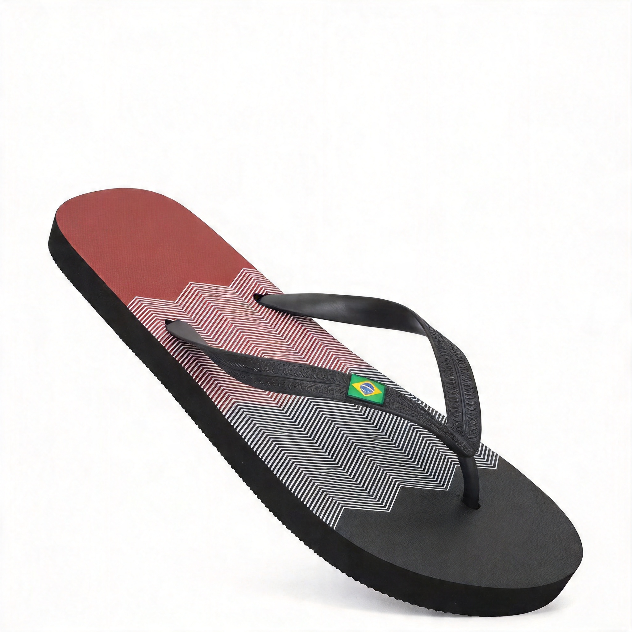 Η σόλα με το έντονο κόκκινο-μαύρο γεωμετρικό σχέδιο και το σήμα της Βραζιλίας προσδίδει μια δυναμική, παραλιακή ατμόσφαιρα, ιδανική για όσους αγαπούν το μοντέρνο στυλ.