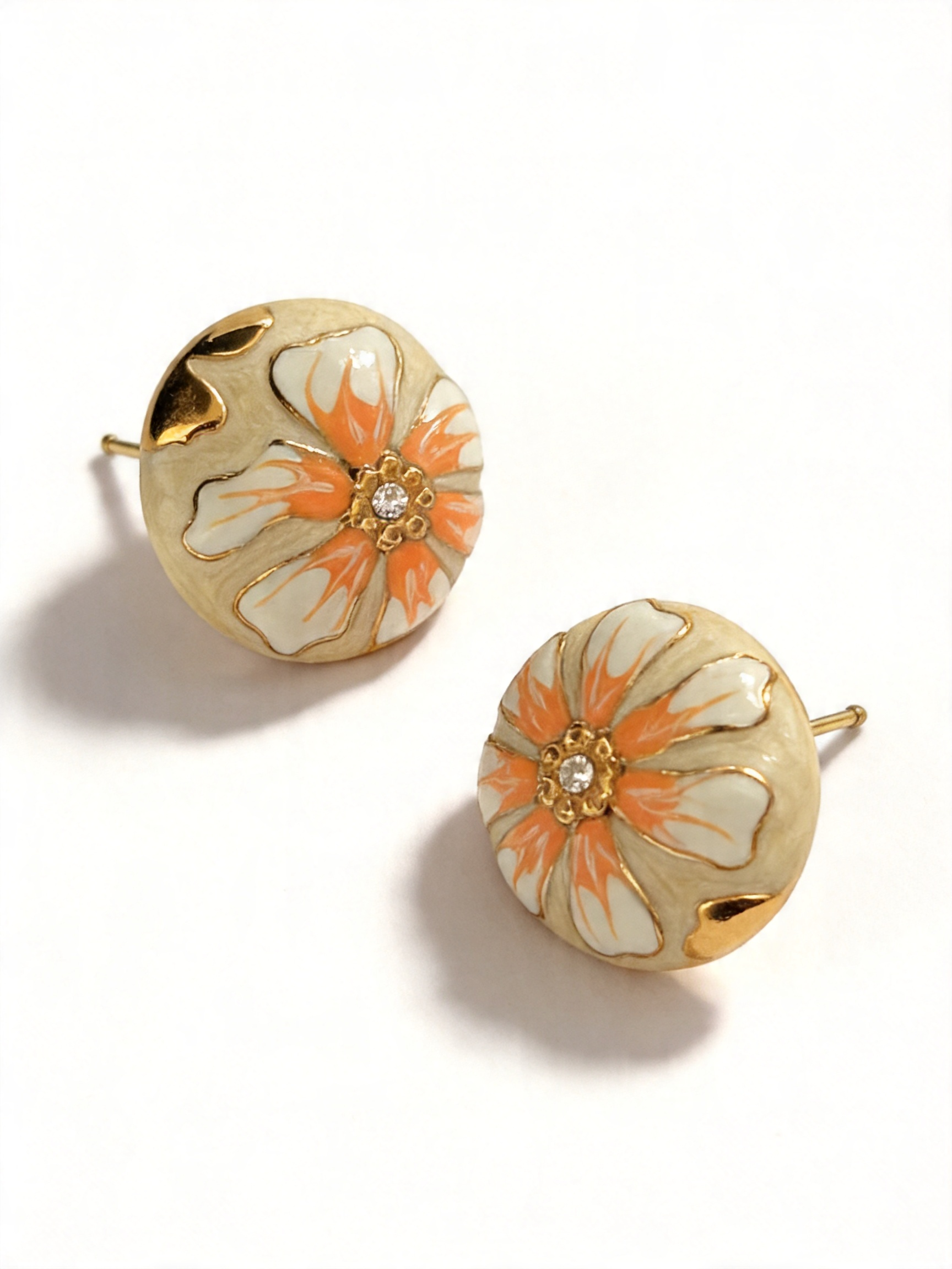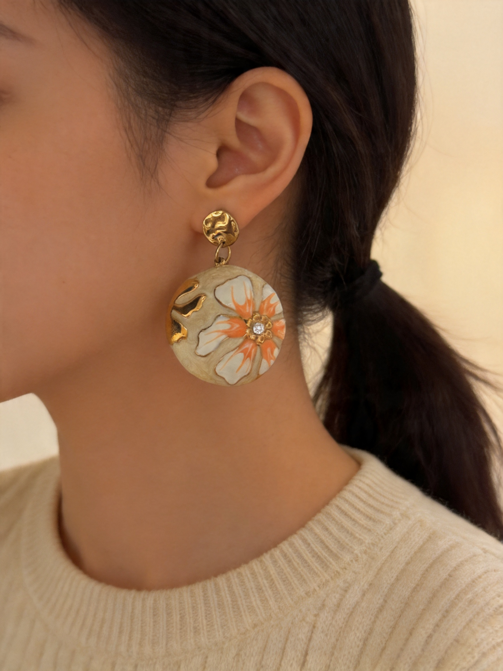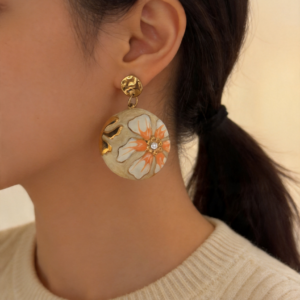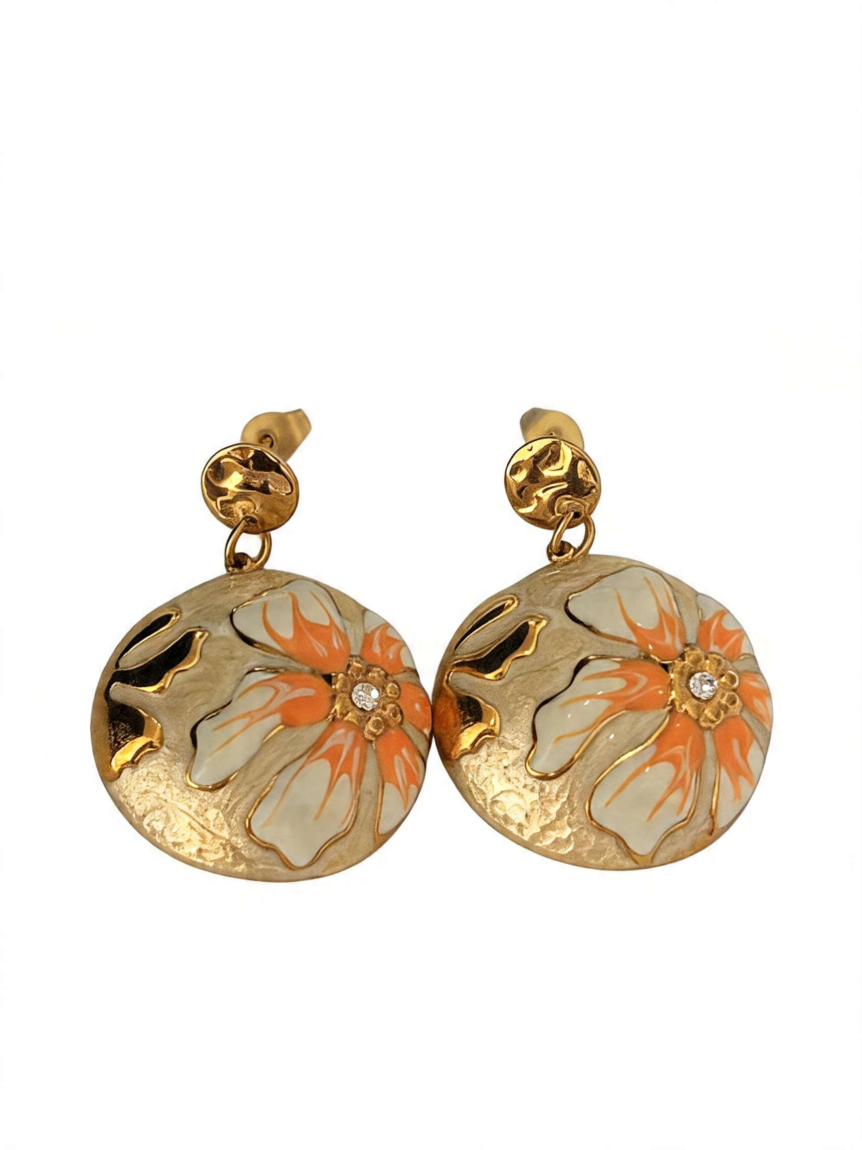 - Σχεδιασμός & Αισθητική: Τα σκουλαρίκια διαθέτουν στρογγυλό πλαίσιο με σμάλτο, με λουλούδι σε πορτοκαλί και λευκή απόχρωση σε κρεμ φόντο, διακοσμημένο με μικρό ζιρκόν στο κέντρο. Το σφυρηλατημένο στρογγυλό μέρος προσδίδει υφή και κομψότητα, ιδανικό για κάθε περίσταση, από την καθημερινή εργασία μέχρι τις ρομαντικές εξόδους.