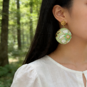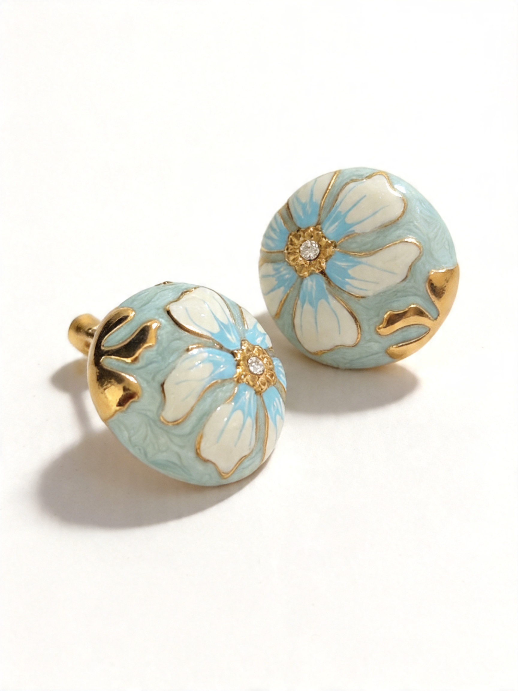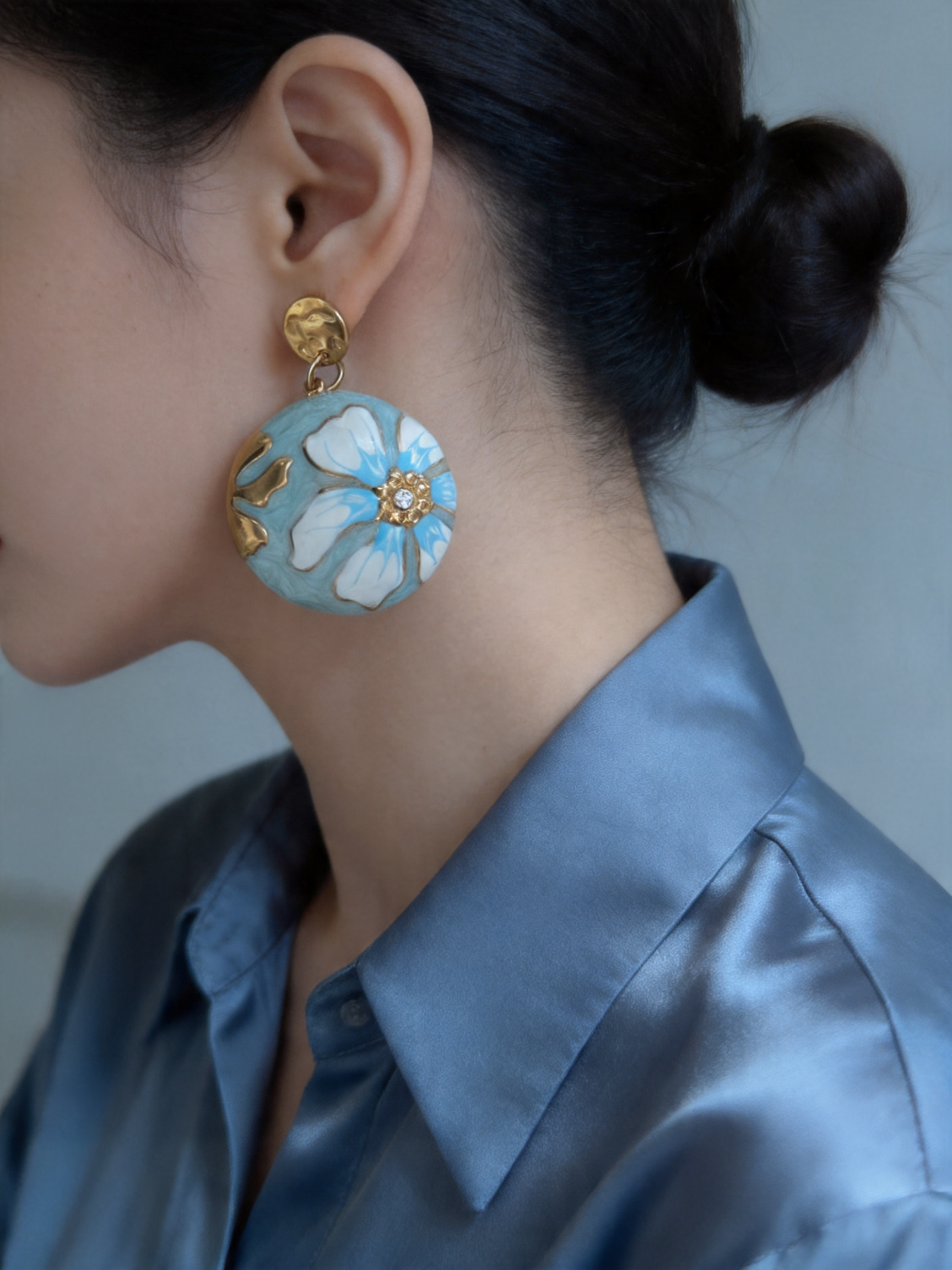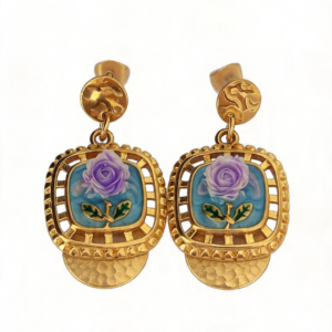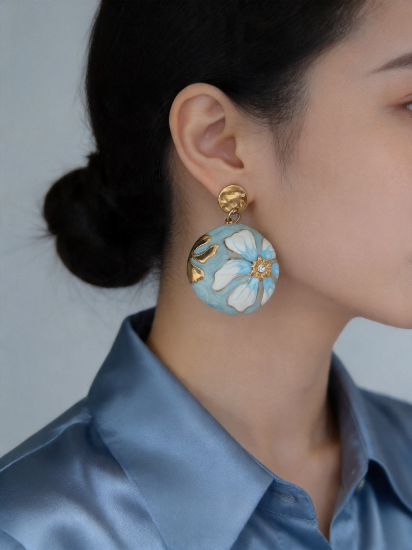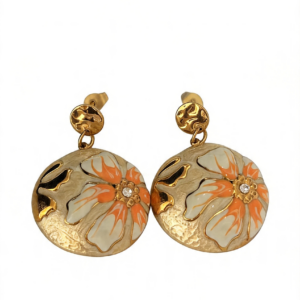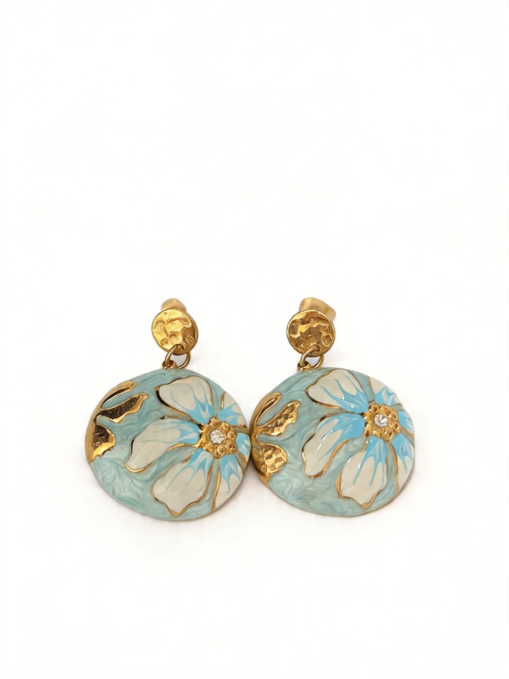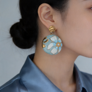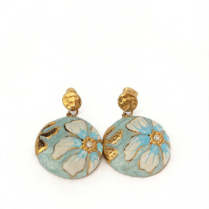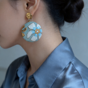 - Σχεδιασμός & Αισθητική: Τα σκουλαρίκια διαθέτουν στρογγυλό πλαίσιο με σμάλτο, με λουλούδι σε λευκή και γαλάζια απόχρωση σε απαλό γαλάζιο φόντο, διακοσμημένο με μικρό ζιρκόν στο κέντρο. Το σφυρηλατημένο στρογγυλό μέρος προσδίδει υφή και κομψότητα, ιδανικό για κάθε περίσταση, από την καθημερινή εργασία μέχρι τις ρομαντικές εξόδους.