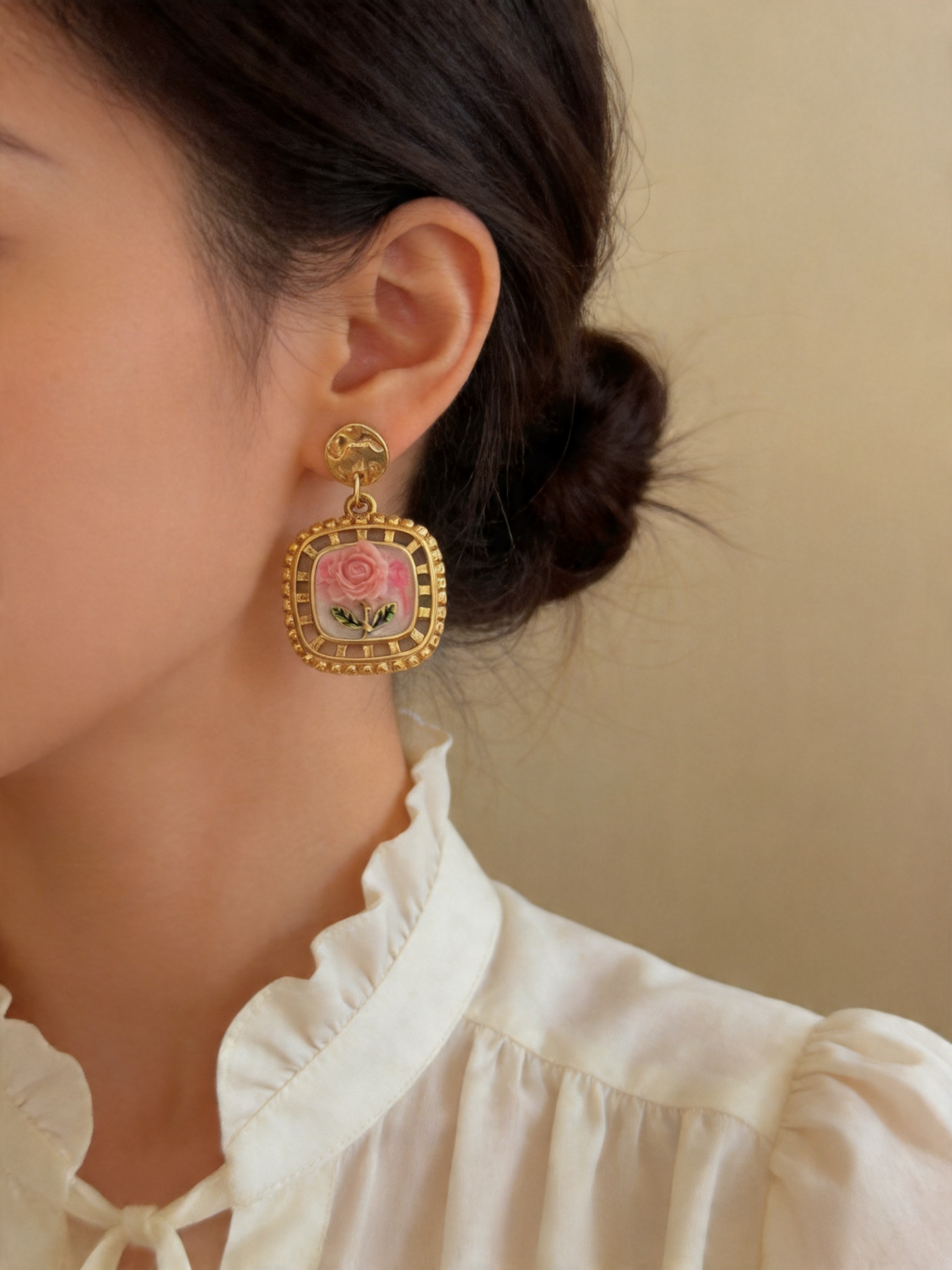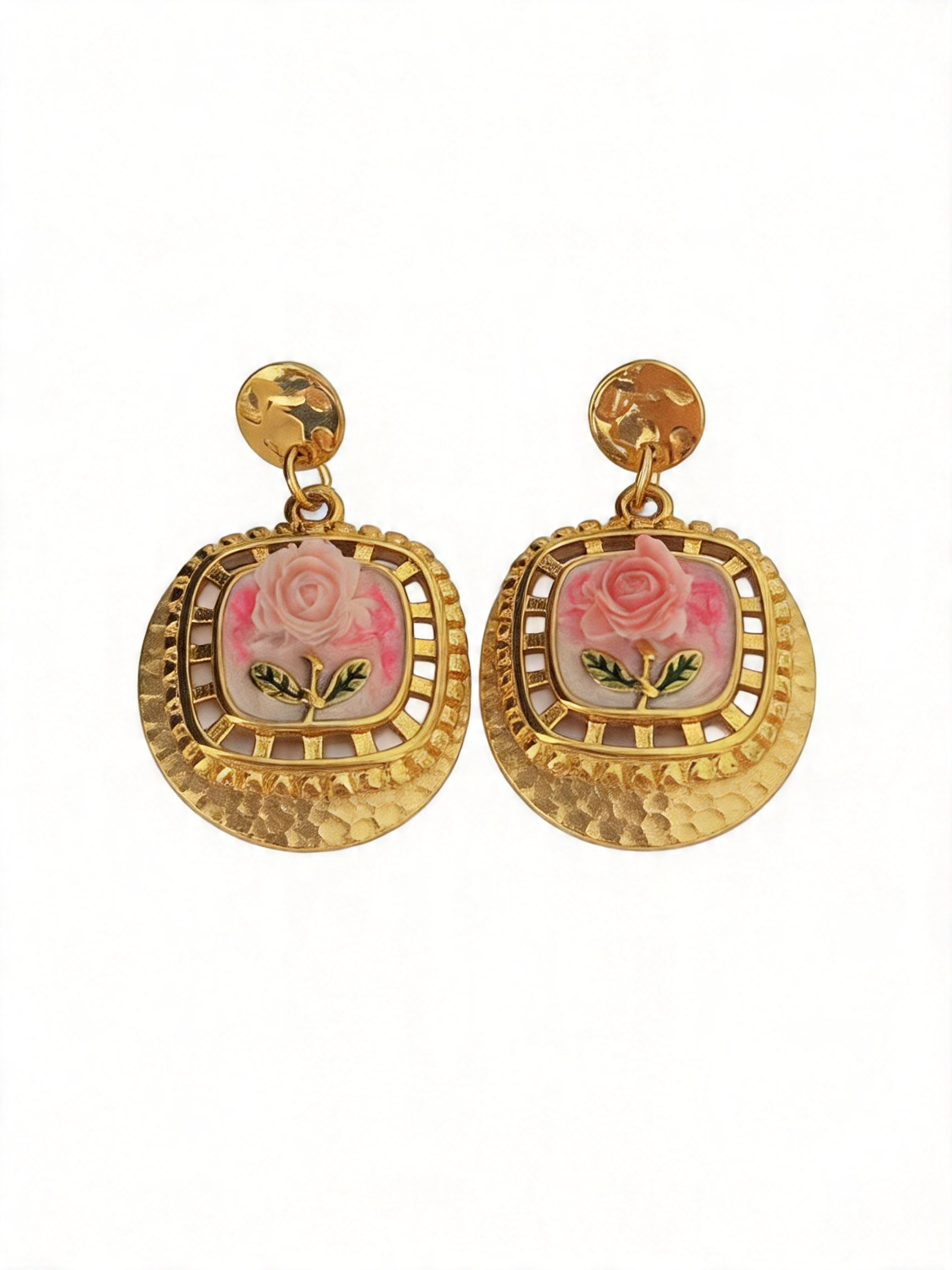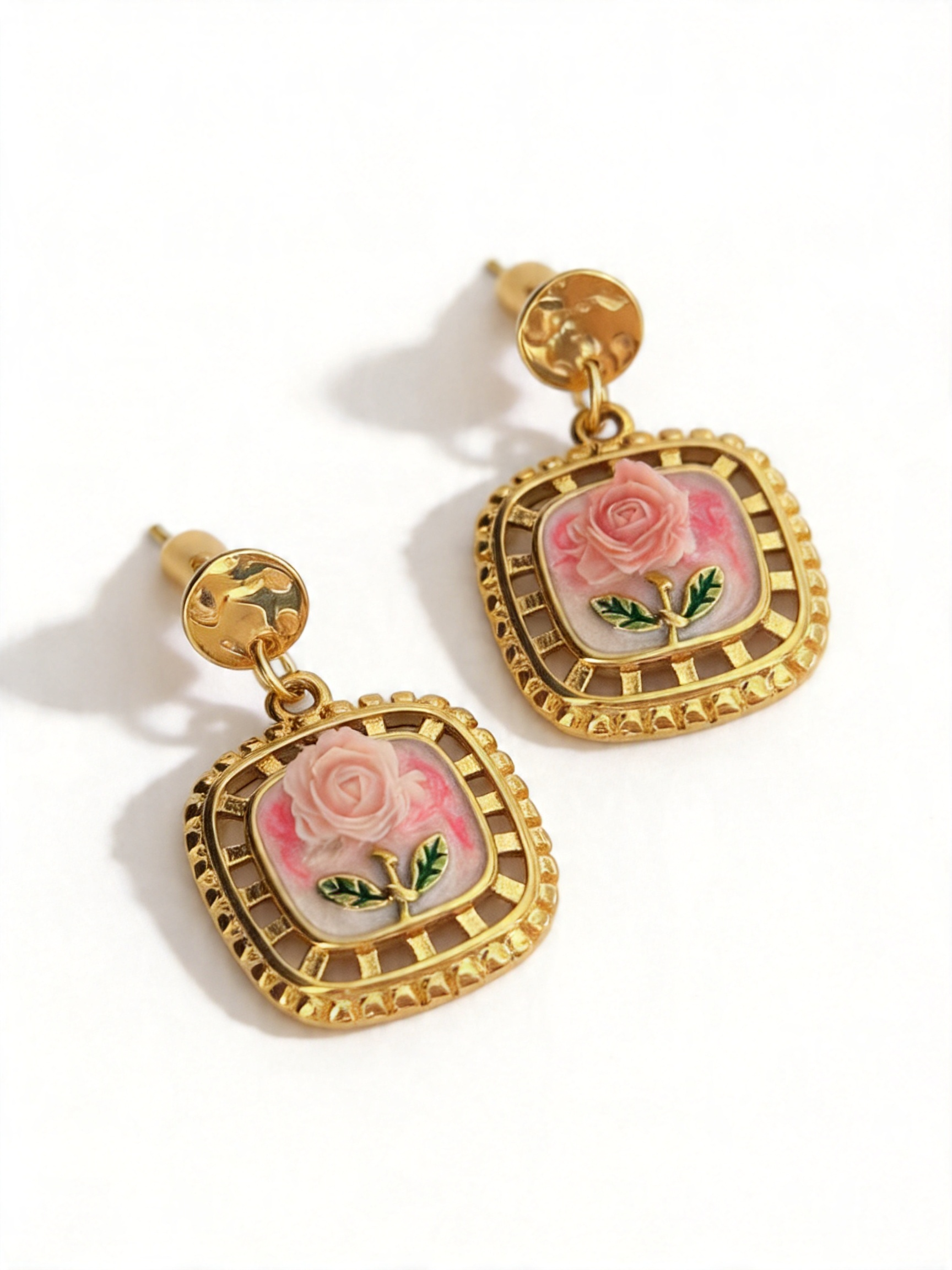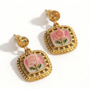 - Σχεδιασμός & Αισθητική: Τα σκουλαρίκια διαθέτουν τετράγωνο κοίλο χρυσό πλαίσιο με ανάγλυφο ροζ τριαντάφυλλο και απαλό ροζ φόντο από σμάλτο. Το σφυρηλατημένο στρογγυλό μέρος προσδίδει υφή και κομψότητα, ιδανικό για κάθε περίσταση, από την καθημερινή εργασία μέχρι τις ρομαντικές εξόδους.