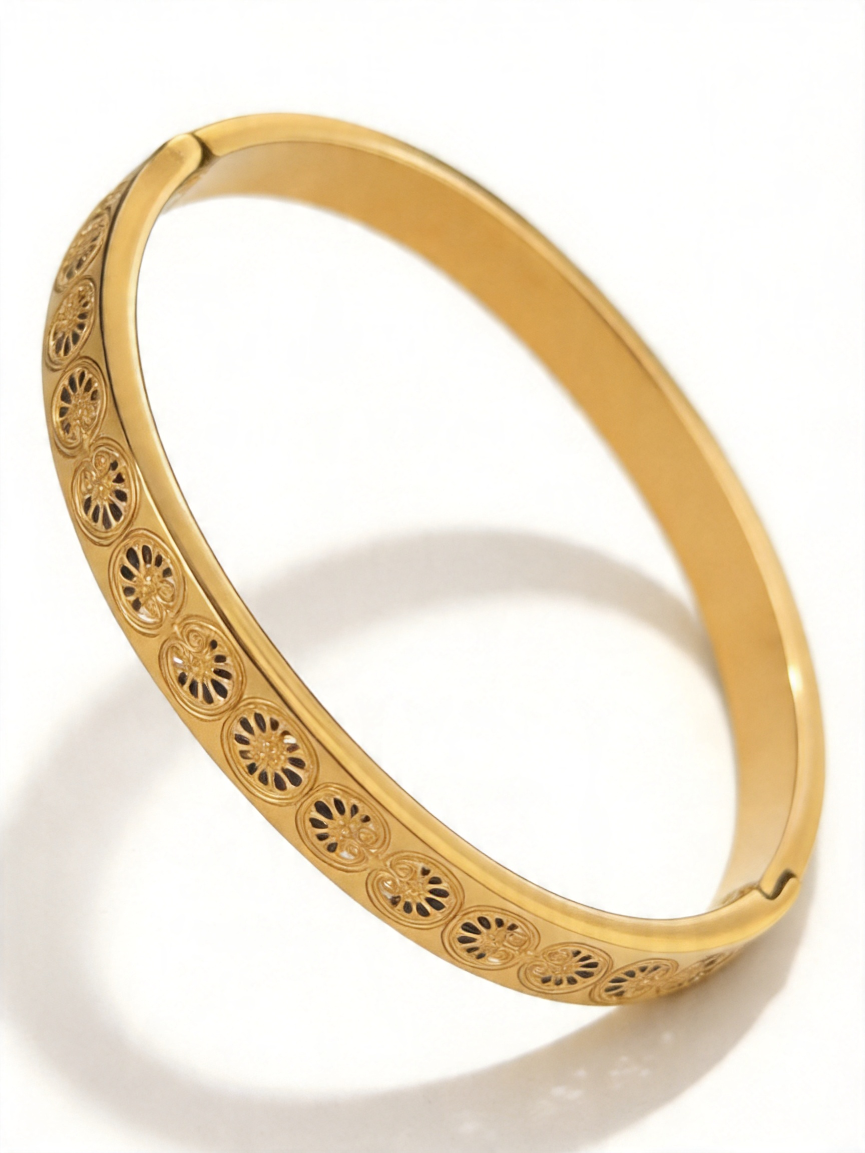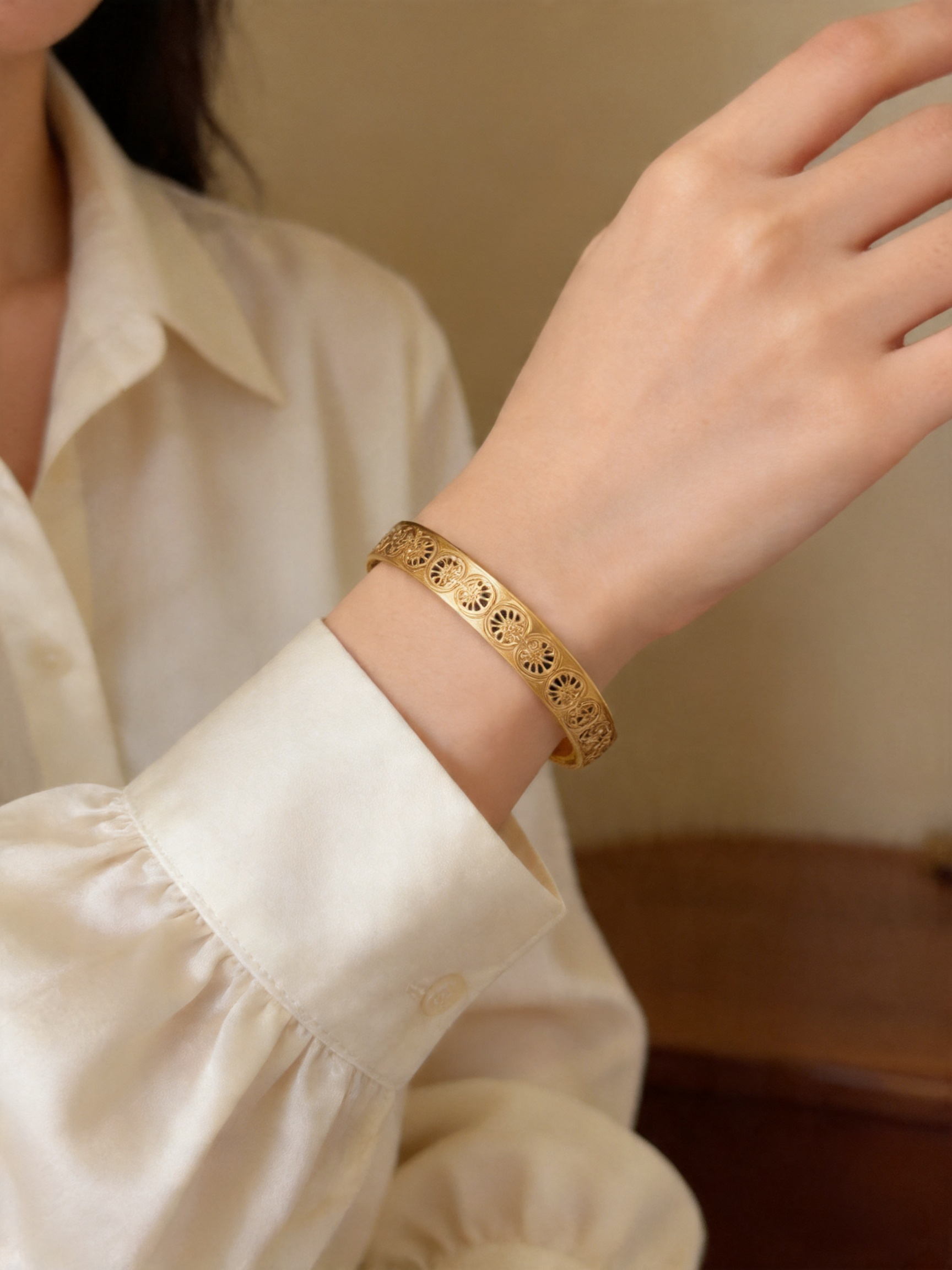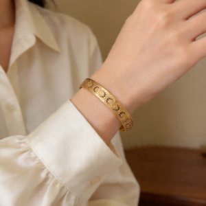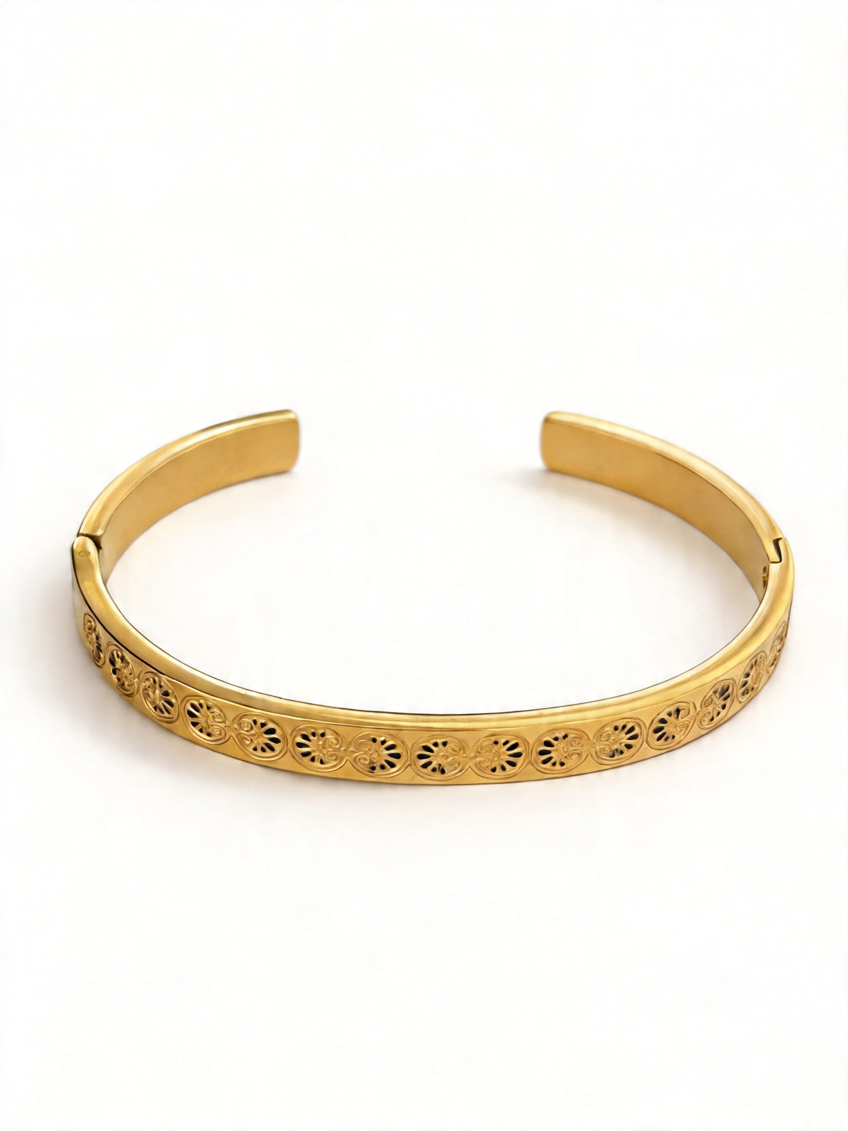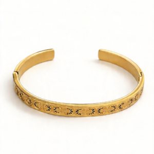 - Σχεδιασμός & Αισθητική: Η επιφάνεια του βραχιολιού διαθέτει συνεχή κυκλικά κομμένα μοτίβα, με λεπτές και ρευστές γραμμές που προσδίδουν κλασική ατμόσφαιρα. Το ματ χρυσό χρώμα είναι απαλό και κομψό, ιδανικό για να φορεθεί μόνο του ή σε συνδυασμό με άλλα αξεσουάρ.