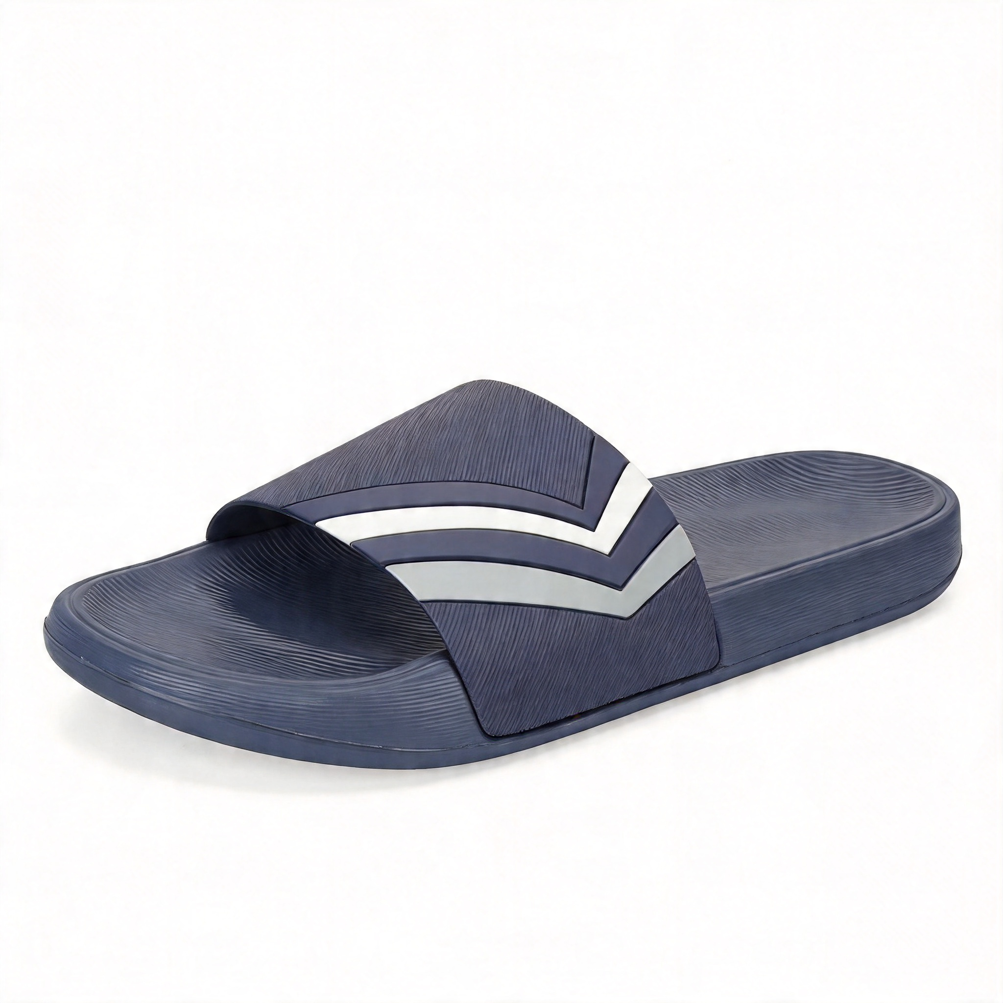 Το βαθύ ναυτικό μπλε χρώμα συνδυάζεται με ασημένιες γραμμές σε σχήμα V, προσδίδοντας μια καθαρή, αθλητική εμφάνιση. Η ανάγλυφη λουρίδα προσφέρει άνεση και στυλ, ταιριάζοντας τέλεια με casual και σπορ outfits.